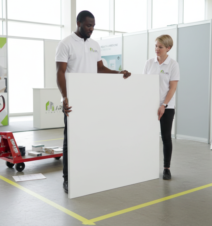 Soluções que respeitam pontos de carga e limites do pavilhão.